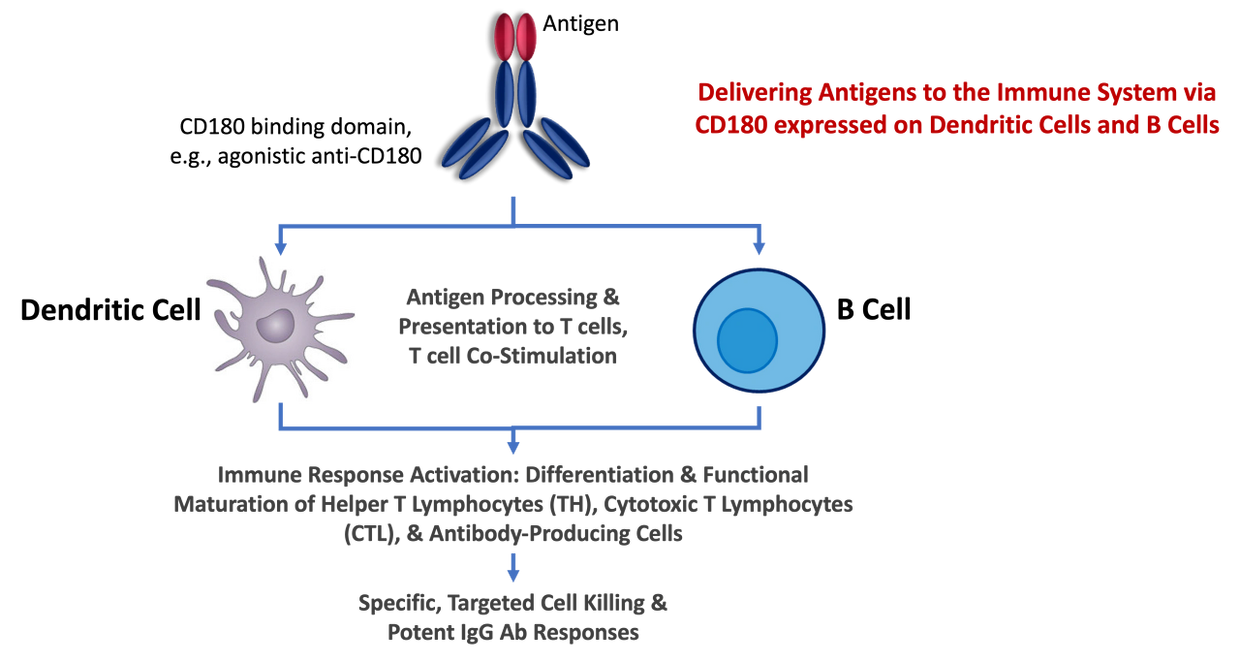 Physical coupling of the CD180 binding domain and antigen programs APCs for active immunotherapeutic responses